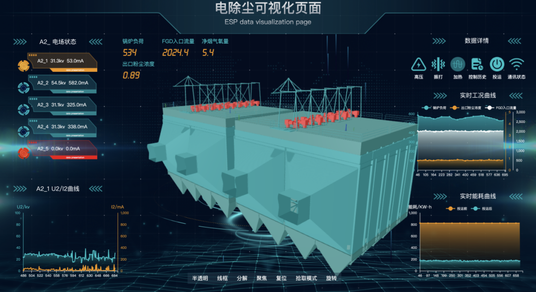 燃煤电站“智慧环保岛优化运行平台”是龙净环保电除尘与脱硝事业部依据当前国家实施双碳目标后,燃煤电站对节能降碳与智慧运营的双重需求,独立开发的新一代环保智慧运营控制技术。该技术通过对脱硫、脱硝、除尘等设备历史和实时数据的采集编码,依托人工智能、大数据、数字孪生等前沿技术手段,深入挖掘各环保设备运行数据特性和潜在规律,融合行业专家知识体系,形成工业级设备智慧控制和故障预警方案,可实现烟气环保岛各设备在实现稳定超低排放的同时,能耗最低、智慧预警、智慧运营,促进国家“双碳目标”达成。截至目前,龙净“智慧环保岛优化运行平台”已在10多家电厂获得认可使用,节能降碳、降本增效成果显著。