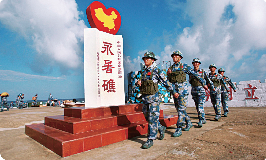 南沙守礁官兵在永暑礁主权碑前巡逻