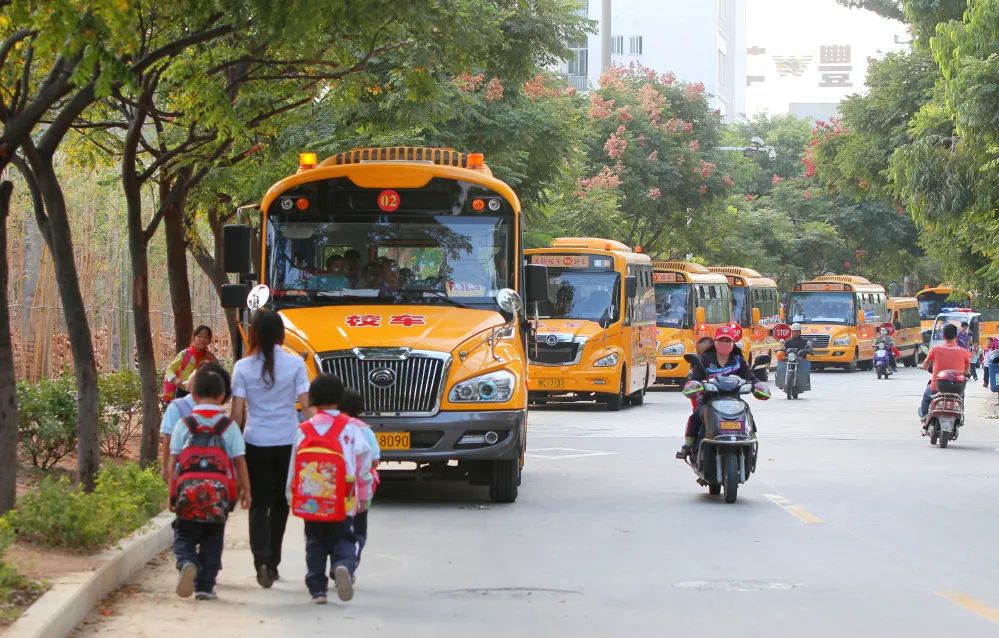 泉州多地大力发展校车,图为泉州开发区实验小学的校车队。