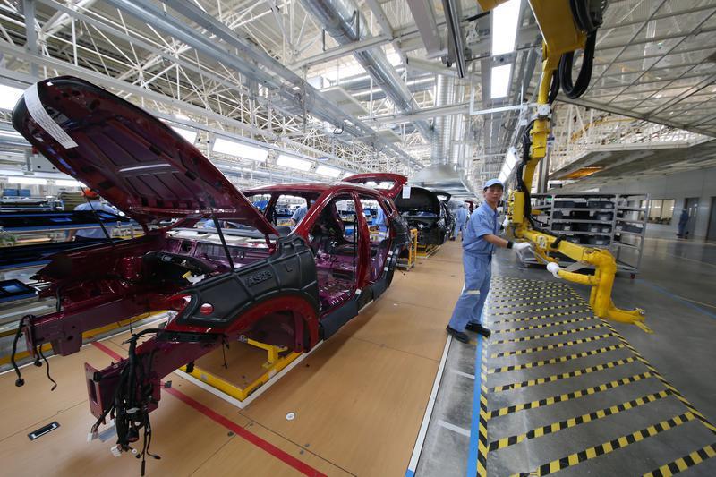 上汽宁德基地流水线上,工人进行汽车组装。