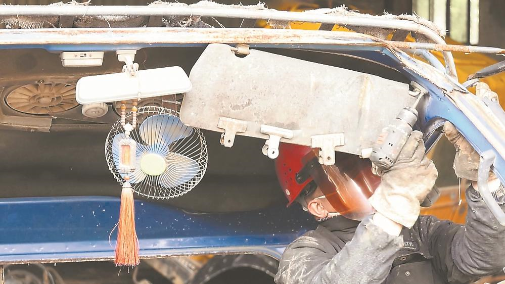 取出蓄电池,收集油箱内残留的汽油,拆卸切割零部件和剩余车身……经过20多道拆解程序,一辆废旧机动车辆就被“瓜分”成若干部件。