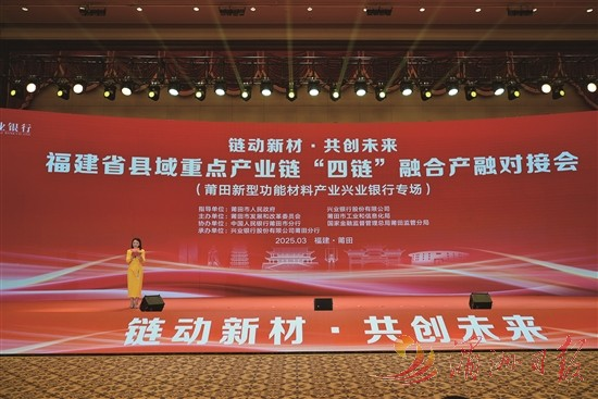 3月31日,福建省县域重点产业链“四链”融合产融对接会(莆田新型功能材料兴业银行产业专场)成功举办,省工信厅、莆田市人民政府、莆田市发展和改革委员会、莆田市工业和信息化局、中国人民银行莆田市分行、国家金融监督管理总局莆田监管分局、市科技局、市招商服务中心、兴业银行、莆田市各县(区)政府(管委会)等领导及相关负责人参加活动,与专家学者、企业代表等齐聚一堂,共话新型功能材料产业“四链”融合新未来。