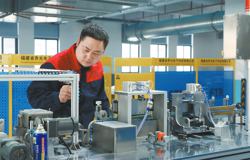 近日,走进漳平乔光电子科技有限公司生产车间,只见自动化产线顺畅运行。产线旁,操作人员不时查看设备屏幕上的生产参数、记录关键数据,并对传送带上的成品进行抽样检验,确保产品质量稳定。项目配套的员工宿舍楼已完成内部装修,后续将开展水电管网安装,以及楼前道路硬化,力求早日投用。