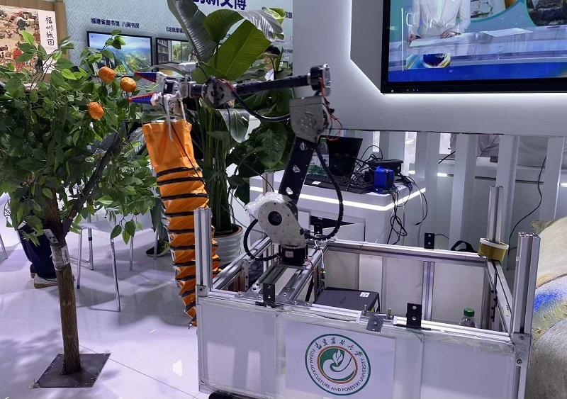 在福建农林大学的展区里,一台“田间黑科技”同样引人注目:机器人精准识别树上果实,轻柔采摘后送入传送带与收集箱。