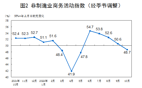 10月份,非制造业商务活动指数为48.7%,比上月下降1.9个百分点,低于临界点,非制造业恢复态势放缓。