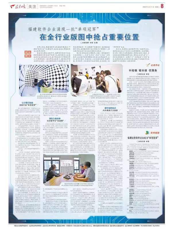记者从省工信厅获悉,目前我省软件行业有近40家企业的产品或者技术在细分领域位居全国甚至全球前列,32家软件企业获得国家级专精特新“小巨人”企业认定。在“拳头产品”上的竞争力,也造就了福建软件企业良好的效益。据统计,50强企业平均利润率达到27.3%,大幅高于行业平均水平14%。