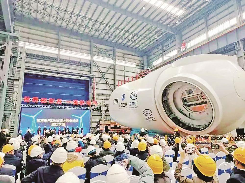 2月22日,我国首台13兆瓦抗台风型海上风电机组在福清顺利下线。