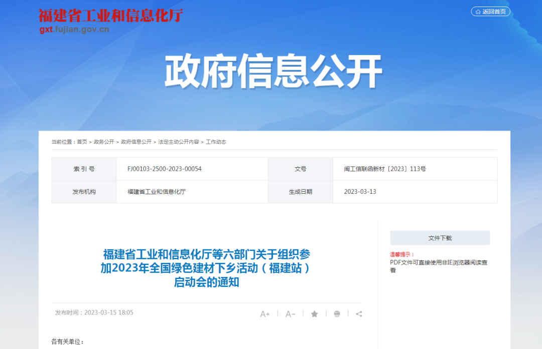 为深入贯彻党的二十大关于建设现代化产业体系、全面推进乡村振兴的决策部署,加快绿色建材生产、认证和推广应用,促进绿色消费,助力美丽乡村建设,推动乡村产业振兴,工业和信息化部等六部门联合开展绿色建材下乡活动。福建省作为绿色建材下乡活动试点省份,由省工信厅、住建厅、农业农村厅、商务厅、市场监管局、乡村振兴局联合制定印发了福建省绿色建材下乡活动方案,组织全省开展相关活动。经研究决定,3月31日在泉州南安市举办2023年全国绿色建材下乡活动(福建站)启动会。