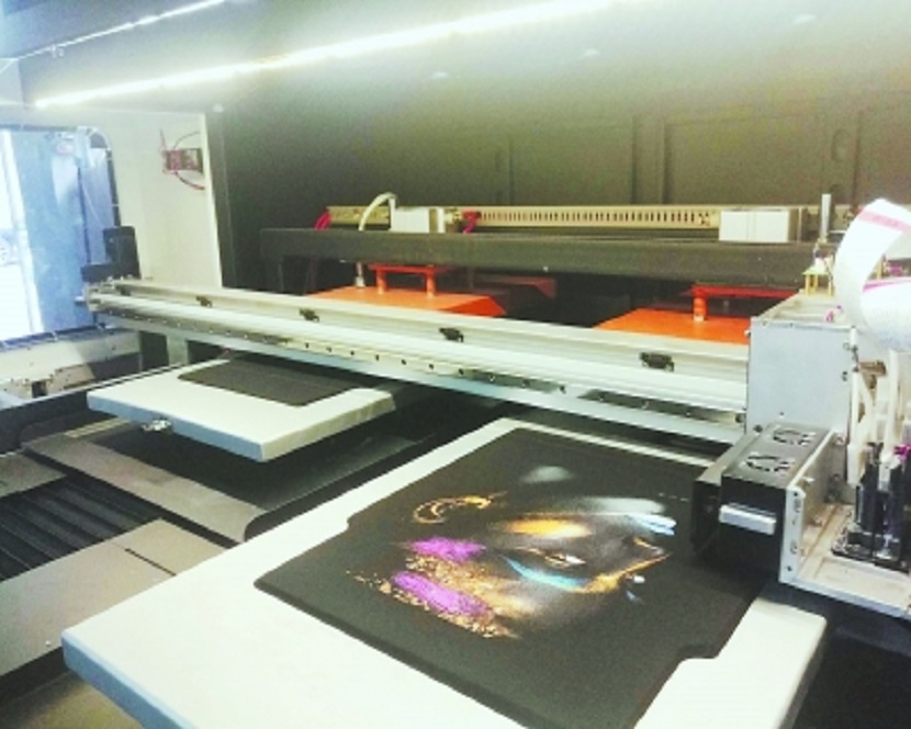 近日,洪建树向记者演示了印花过程。只见他把一件黑色T恤放入打印区,从左边电脑里随意调试出一张印花图案,然后在操控区按下打印键,1分钟左右,印花就完成了。经打印出的产品,只要再经过一道烘干程序,衣服就可以包装销售了。 记者看到,印图五彩斑斓,栩栩如生。