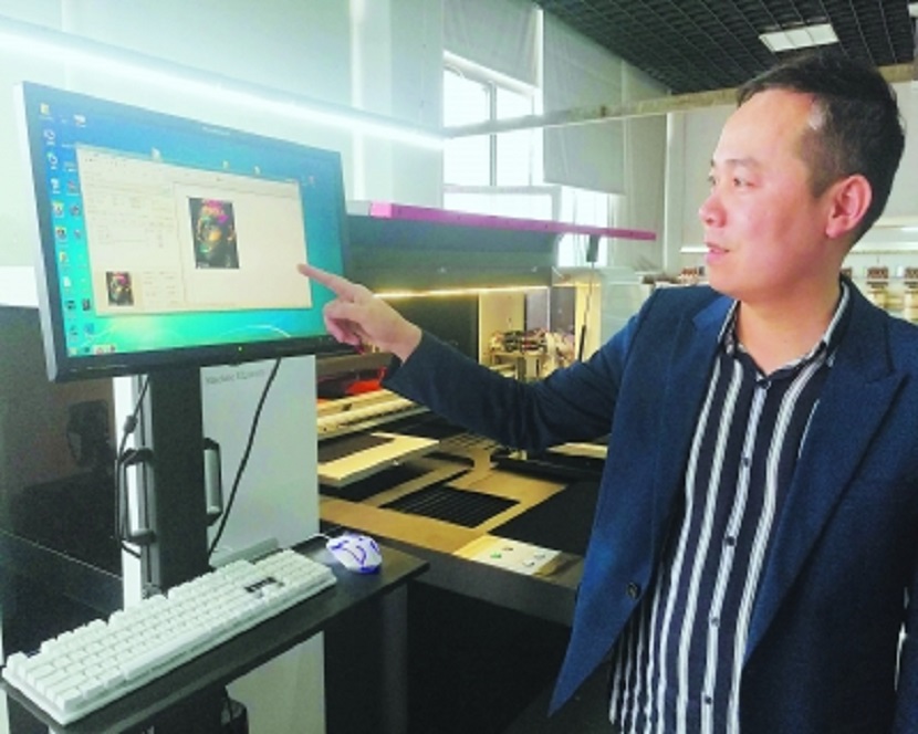智能印花设备和打印的作品。(记者 程枝文 通讯员 许晓城 文/图)