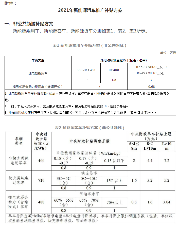 为创造稳定政策环境,2021年保持现行购置补贴技术指标体系框架及门槛要求不变。根据《财政部 工业和信息化部 科技部 发展改革委关于完善新能源汽车推广应用财政补贴政策的通知》(财建〔2020〕86号)要求,2021年,新能源汽车补贴标准在2020年基础上退坡20%;为推动公共交通等领域车辆电动化,城市公交、道路客运、出租(含网约车)、环卫、城市物流配送、邮政快递、民航机场以及党政机关公务领域符合要求的车辆,补贴标准在2020年基础上退坡10%。为加快推动公共交通行业转型升级,地方可继续对新能源公交车给予购置补贴。
