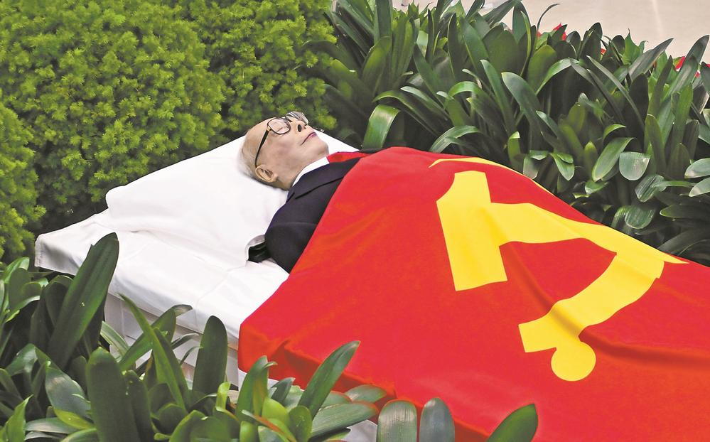 12月5日,江泽民同志的遗体安卧在鲜花翠柏丛中,身上覆盖着鲜红的中国共产党党旗。