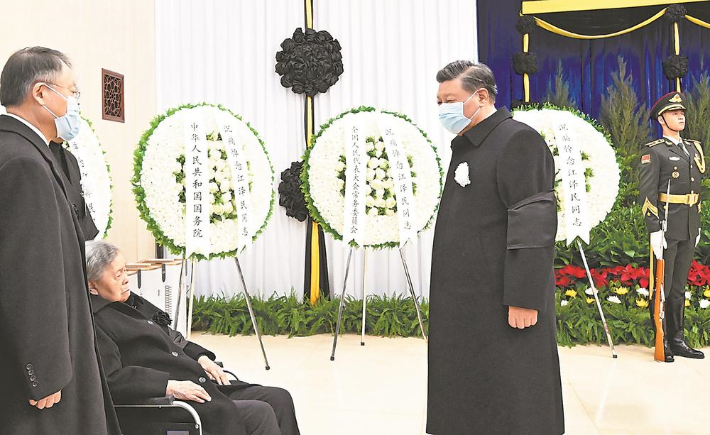 上午10时,在低回的哀乐声中,习近平、李克强、栗战书、汪洋、李强、赵乐际、王沪宁、韩正、蔡奇、丁薛祥、李希、王岐山、胡锦涛等,胸佩白花、臂戴黑纱缓步来到告别室,在江泽民同志的遗体前肃立。习近平等向江泽民同志的遗体三鞠躬,表达对江泽民同志的崇高敬意和深切缅怀。随后,习近平等向江泽民同志的夫人王冶坪和亲属表示深切慰问。