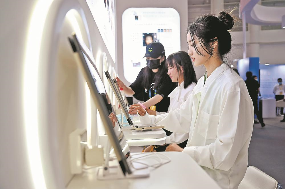 参观者在第五届数字中国建设成果展览会上体验虚拟试妆。