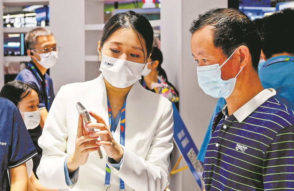 在腾讯展区,工作人员向观众介绍智慧交通应用场景。
