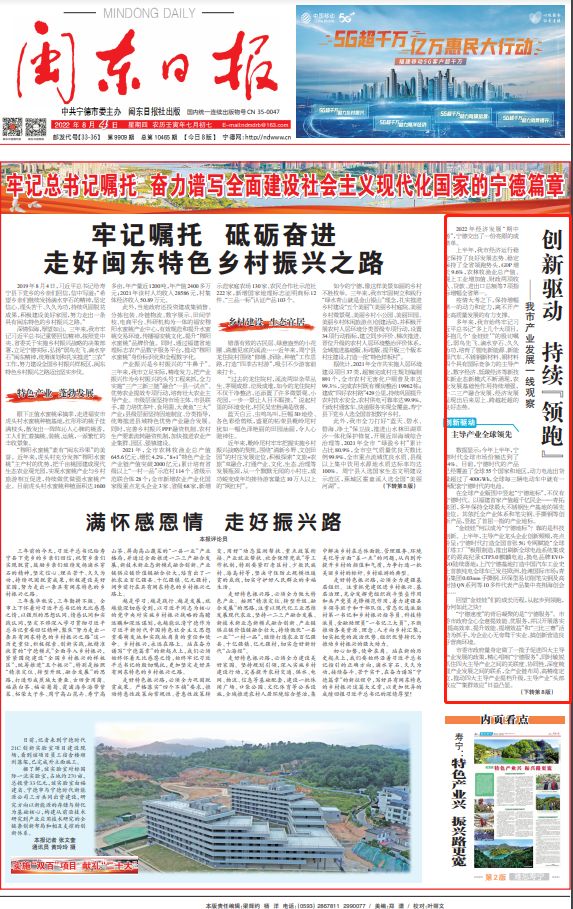 我市始终坚持把产业振兴作为乡村振兴的“头号工程”,立足闽东特色,着力做好精准定位、转型升级、融合发展“三篇文章”,2021年全市农林牧渔业总产值645.6亿元、增长4.2%,“8+1”特色产业全产业链产值突破2000亿元。