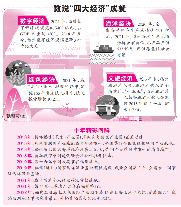 十年间,带着更大体量腾飞,福州在发展之路上坚定不移贯彻新发展理念,绘就发展新图景:数字经济蓬勃发展,海洋经济涌起新潮,绿色经济生机盎然,文旅经济加速复苏……经济发展“高素质”与生态环境“高颜值”相得益彰。