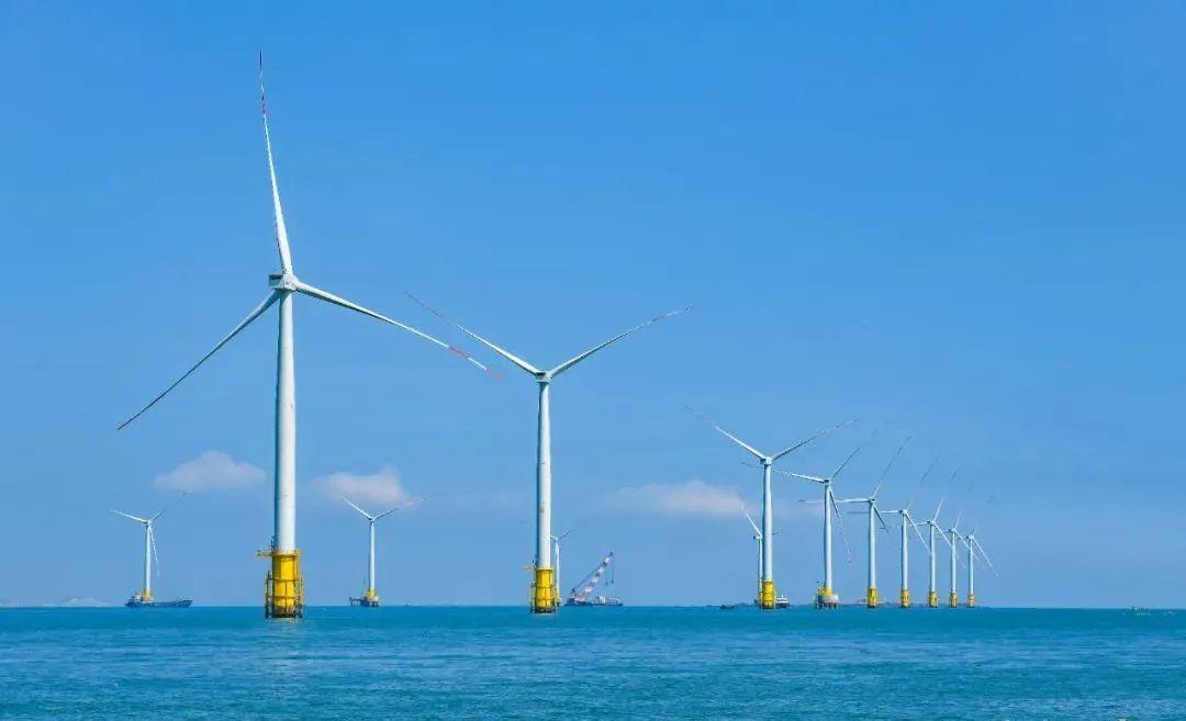 广阔的海面上,一台台百米高的风电机组错落有致,犹如一根根定海神针迎风矗立。