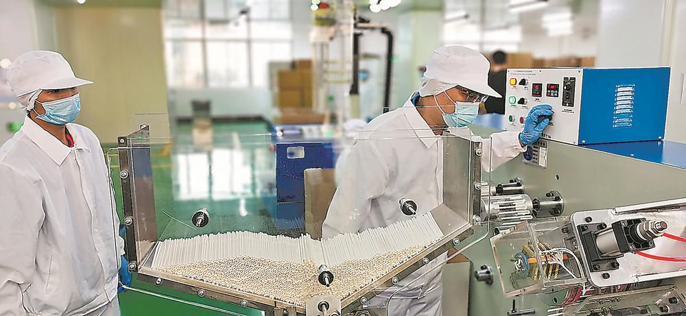 明扬纸品生产线正开足马力生产纸吸管。 陈盛钟 摄