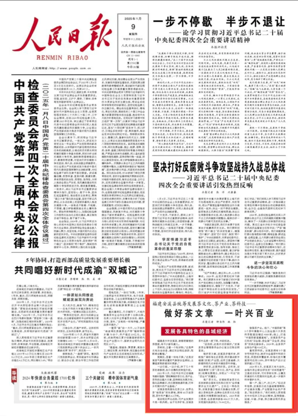 《人民日报》头版“发展各具特色的县域经济”专栏刊发《做好茶文章 一叶兴百业——福建安溪县统筹发展茶文化、茶产业、茶科技》