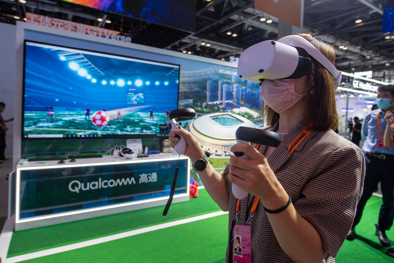 在国家会议中心综合展区的高通展台,参观者通过工体元宇宙GTVerse,沉浸式体验足球带来的乐趣。