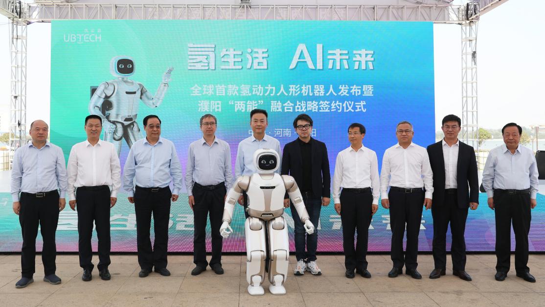 9月28日,氢生活、AI未来——全球首款氢动力人形机器人发布暨濮阳“两能”融合战略签约仪式在濮阳举行。在全球首款氢动力人形机器人“一行”发布的同时,濮阳与优必选科技就人工智能与氢能“两能”融合达成战略合作,积极探索和实施以人工智能驱动新能源发展战略,助力实现我国“碳达峰、碳中和”的目标,推动经济绿色高质量发展。