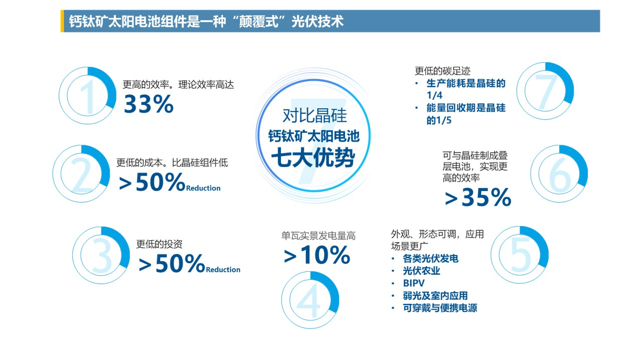 “钙钛矿技术不仅可以打破晶硅电池技术转换效率的理论‘天花板’,还可以降低光伏产业度电成本,是唯一具有商业化应用前景的新兴光伏技术。”范斌说,“钙钛矿太阳能电池大规模进入市场之后,凭借更高的光电转化效率和显著下降的成本,有机会在较短时间内成为市场主流。”