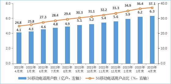 移动电话用户规模稳中有增,5G用户数快速发展。截至4月末,三家基础电信企业的移动电话用户总数达17.07亿户,比上年末净增2336万户。其中,5G移动电话用户达6.34亿户,比上年末净增7308万户,占移动电话用户的37.1%,占比较上年末提高3.8个百分点。