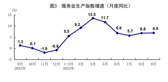 前三季度,服务业增加值同比增长6.0%。其中,住宿和餐饮业,信息传输、软件和信息技术服务业,租赁和商务服务业,交通运输、仓储和邮政业,金融业增加值分别增长14.4%、12.1%、9.5%、7.5%、7.0%。9月份,服务业生产指数同比增长6.9%,比上月加快0.1个百分点,增速连续2个月回升。其中,住宿和餐饮业,信息传输、软件和信息技术服务业,交通运输、仓储和邮政业生产指数分别增长17.7%、11.3%、9.3%。1-8月份,全国规模以上服务业企业营业收入同比增长7.2%。9月份,服务业商务活动指数为50.9%,比上月上升0.4个百分点;业务活动预期指数为58.1%。其中,水上运输、邮政、电信广播电视及卫星传输服务、互联网软件及信息技术服务、货币金融服务等行业商务活动指数位于55.0%以上较高景气区间。