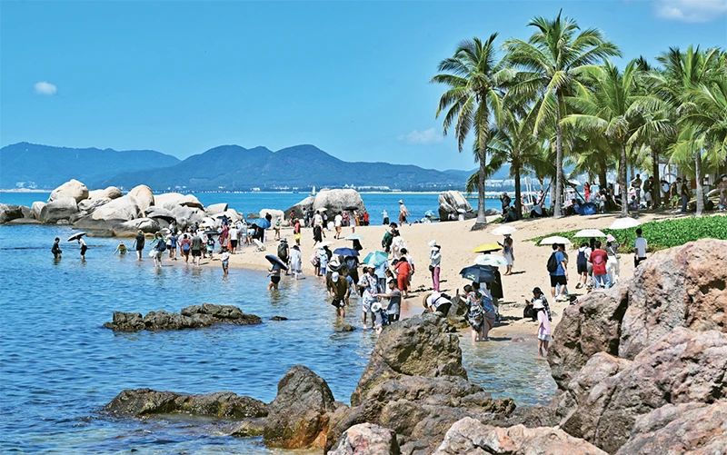 我国经济社会全面恢复常态化运行以来,消费回暖跑出“加速度”,成为经济增长的主拉动力。图为2023年10月1日,游客在三亚市天涯海角游览区游玩。