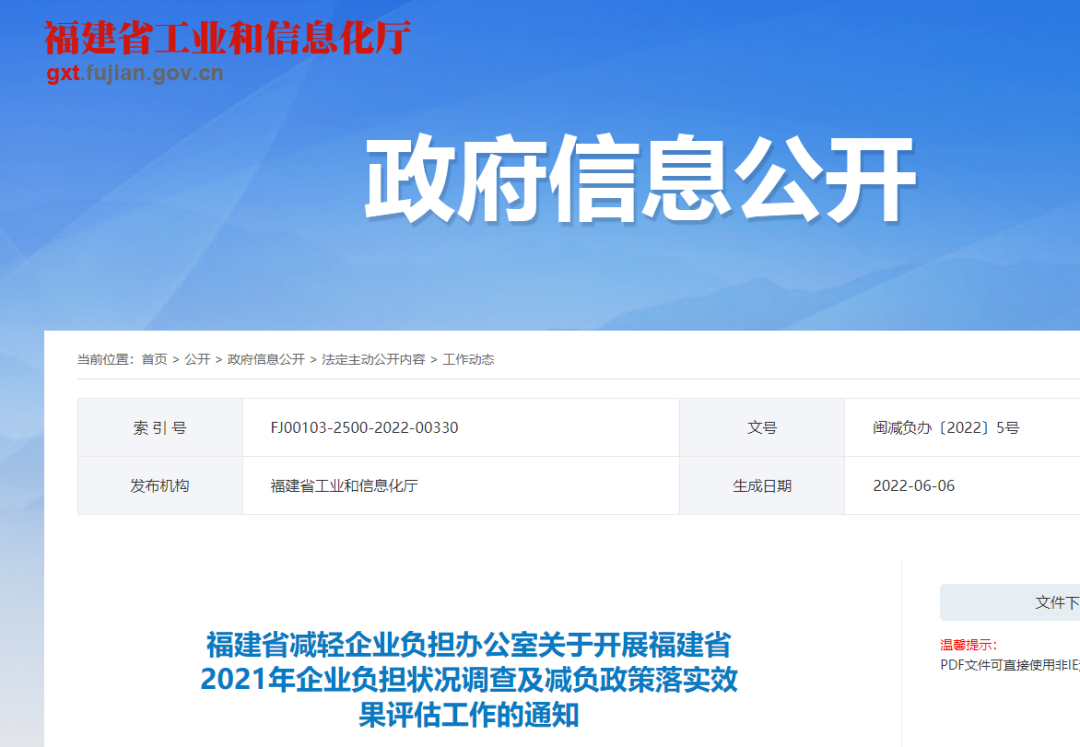 为贯彻落实国务院减轻企业负担部际联席会议《减轻企业负担工作规则》和省委省政府对减轻企业负担工作的要求,深入了解我省各地企业负担状况,评估我省减负政策落实效果,近日省工信厅印发通知,开展2021年企业负担状况调查及减负政策落实效果评估工作,评估时间截至2022年6月30日。