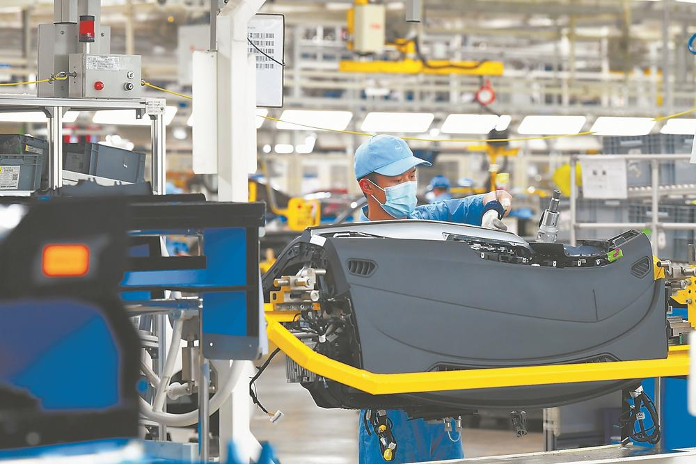6月7日,上汽集团乘用车宁德基地总装车间,工人装配汽车仪表中控。