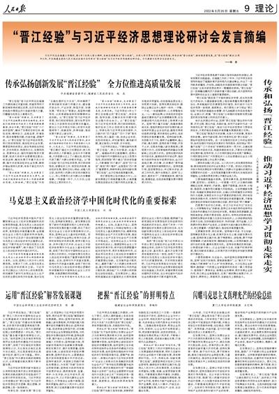 8月26日出版的《人民日报》9版“理论”,整版刊登《“晋江经验”与习近平经济思想理论研讨会发言摘编》。以下是版面内容的摘登:
