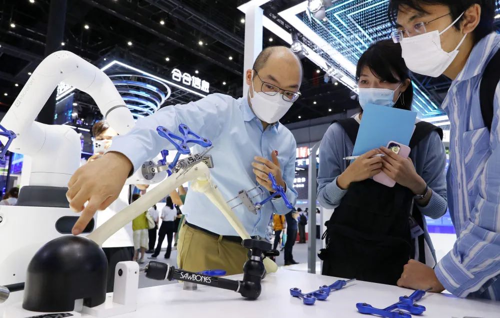 2022年9月1日,工作人员(左一)向参观者介绍微创骨科手术机器人。当日,2022世界人工智能大会在上海世博中心拉开帷幕。