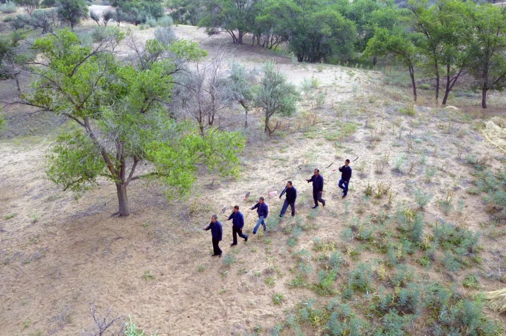 在甘肃省武威市古浪县八步沙林场,场长郭万刚(左一)和大家一起前往治沙点(2019年8月23日摄,无人机照片)。