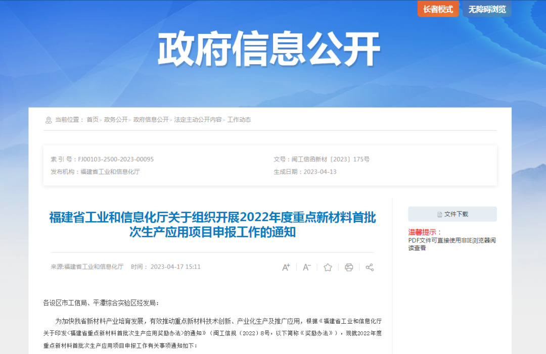 为加快我省新材料产业培育发展,有效推动重点新材料技术创新、产业化生产及推广应用,根据《福建省工业和信息化厅关于印发<福建省重点新材料首批次生产应用奖励办法>的通知》(闽工信规〔2022〕8号,以下简称《奖励办法》),近日,省工信厅发布通知,启动2022年度重点新材料首批次生产应用项目申报工作,申报截止时间为2023年5月17日。
