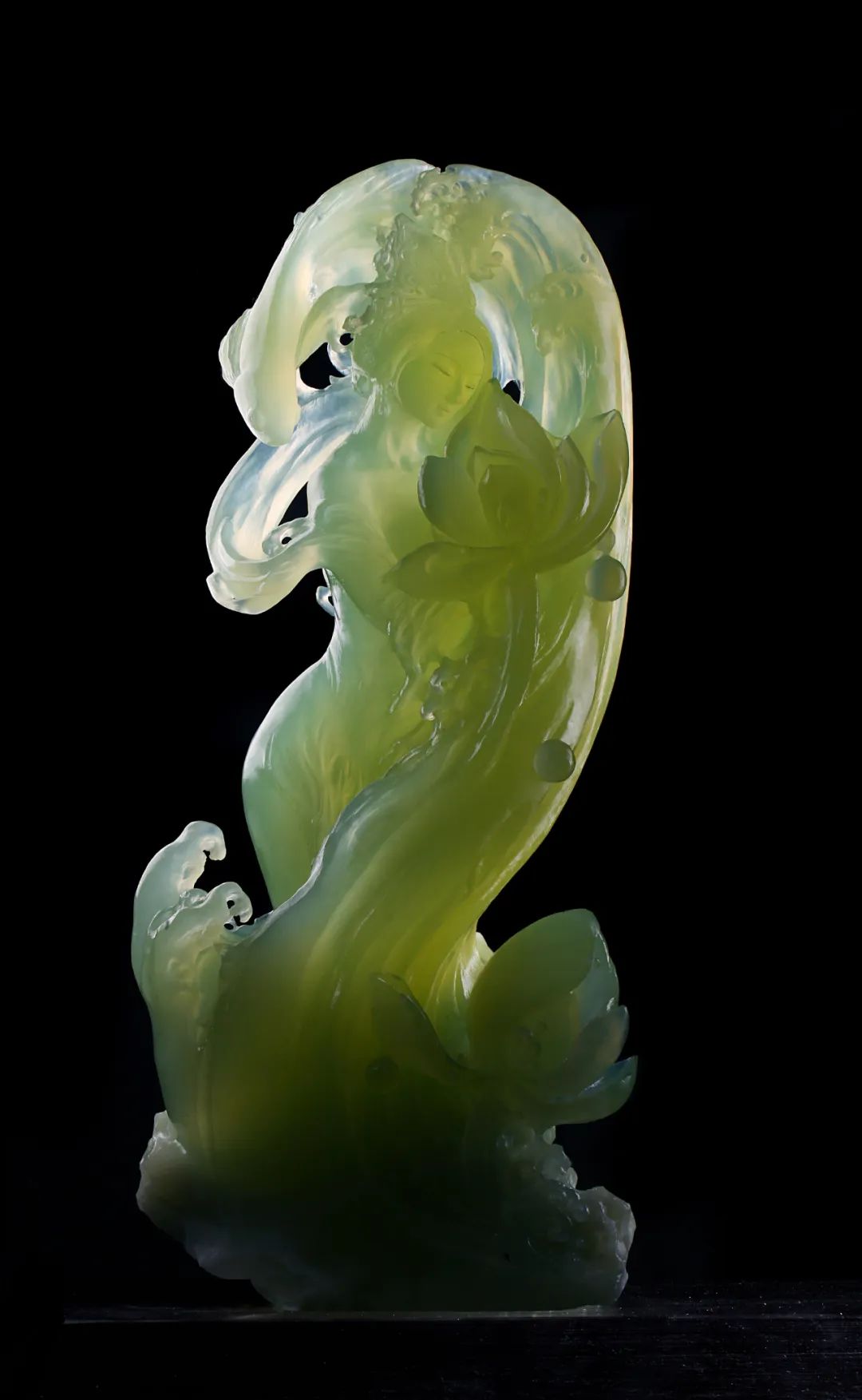 作品简介:“莲连有鱼”,取“年年有余”之美好寓意,借莲、鱼的意象巧作构思。圆雕结合镂雕,用新古典浪漫主义表现手法演绎岫玉之美,造型兼具古典与现代。两杆迎风摇曳的青莲指代“年年”,鱼儿轻甩着飘逸的长尾自高高抛起的水浪中顺势跃出,对应“有余”。在游鱼与青莲之间安排了亭亭玉立的仙子,演绎静若处子的恬淡,动静相宜,以动衬静,美人低头,仿佛在轻嗅莲香。