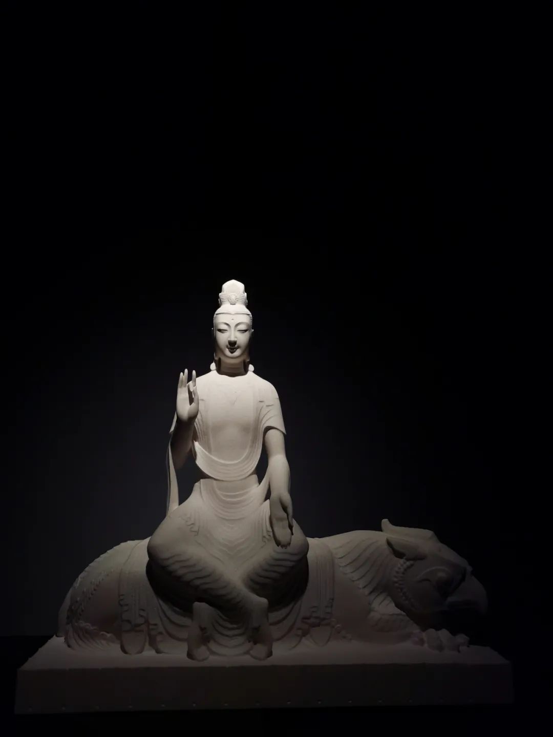 作品简介:交脚弥勒菩萨头戴高宝冠,面庞略长,双目呈丹凤,五官秀美,面容慈祥,充满笑意。帔巾于座前交叉,呈动感之状。右手上举胸前施无畏印,左手下置膝侧结与愿印,双腿交叉,交脚坐于坐骑之上,整个身躯挺拔、修长,形象秀美,既散发着无量的慈悲又不失睿智慈祥。