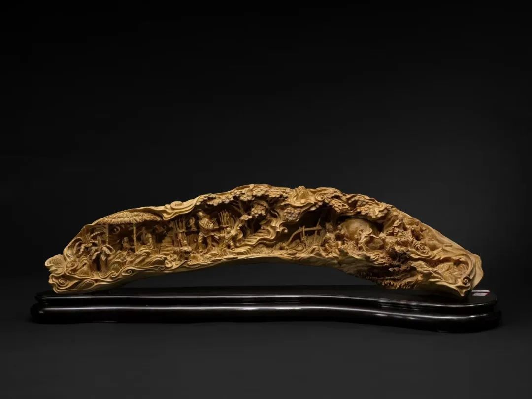 作品简介:作品以立体内雕的风格呈现,整体半包围的形态布局加大雕刻的难度,主题人物的塑造表现生动贴切。樵夫担材的形体动态健壮有力,农夫沧桑的面容憨厚可亲,渔夫垂钓神态心平惬意,书生气质儒雅庄重……各个人物的刻画表现,神形具备,生动传神。