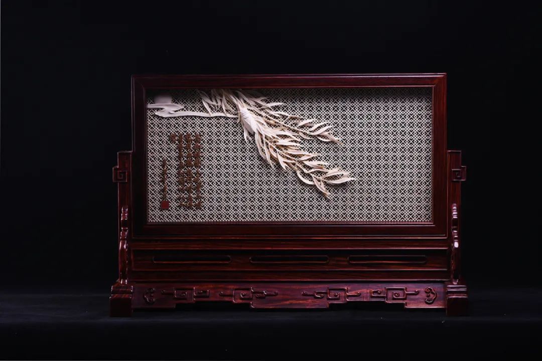 作品简介:选用猛犸象牙材质,造型为中规中矩的方形,与长方形桌面和谐匹配,凸显审美情趣。置于桌上,插屏能隔断空间,亦是一道亮丽的风景,小叶紫檀与猛犸牙两种材质形成对比互衬,色泽与纹理亦相映成趣。虽置于室内,却使观者感到视野开阔、舒畅。