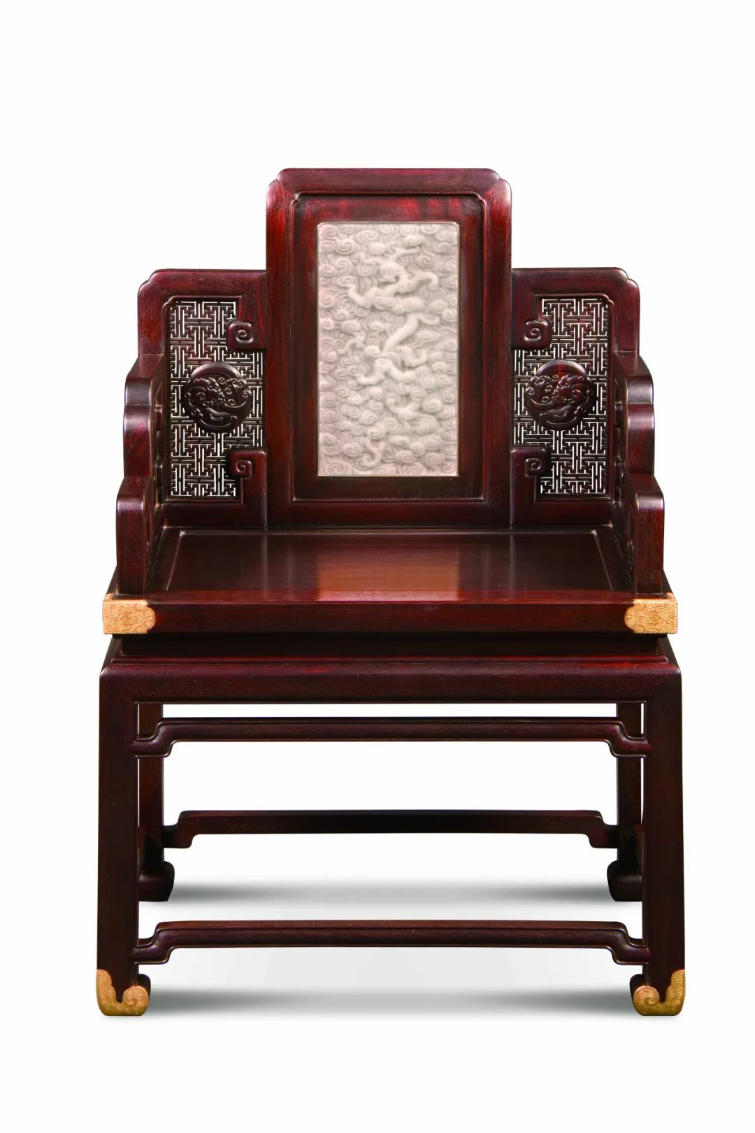 作品简介:此款为故宫复刻款,宝座为五屏风式座围,后背三扇,后背正中一扇稍高,背板制攒框装芯,芯板正面嵌天然汉白玉,雕刻螭龙,层次深浅变化,云纹密集;以中国榫卯古法构体,五屏风式座围,庄严吉祥。此椅鉴采西风,熔铸中体,实为合璧之作,传承有序。