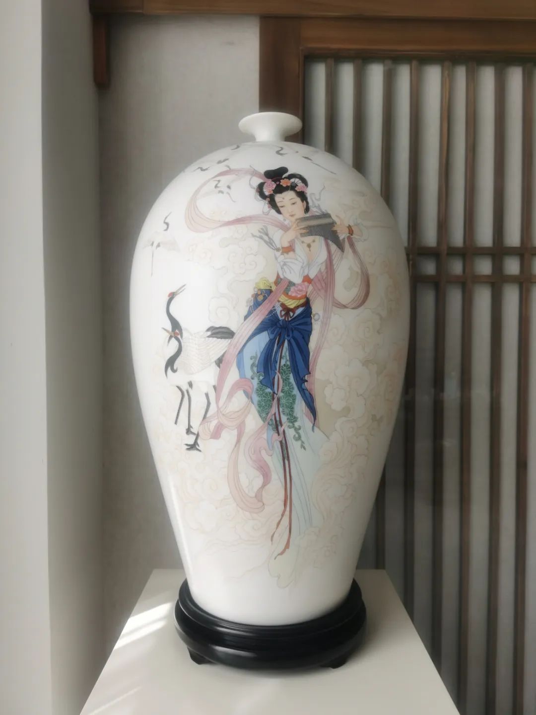 作品简介:作品选用德化羊脂玉白瓷为胎体,釉上新彩手绘吹箫飞天图。吹箫飞天创作源于敦煌莫高窟飞天壁画,画面绘有松鹤,寓意长寿和吉祥。