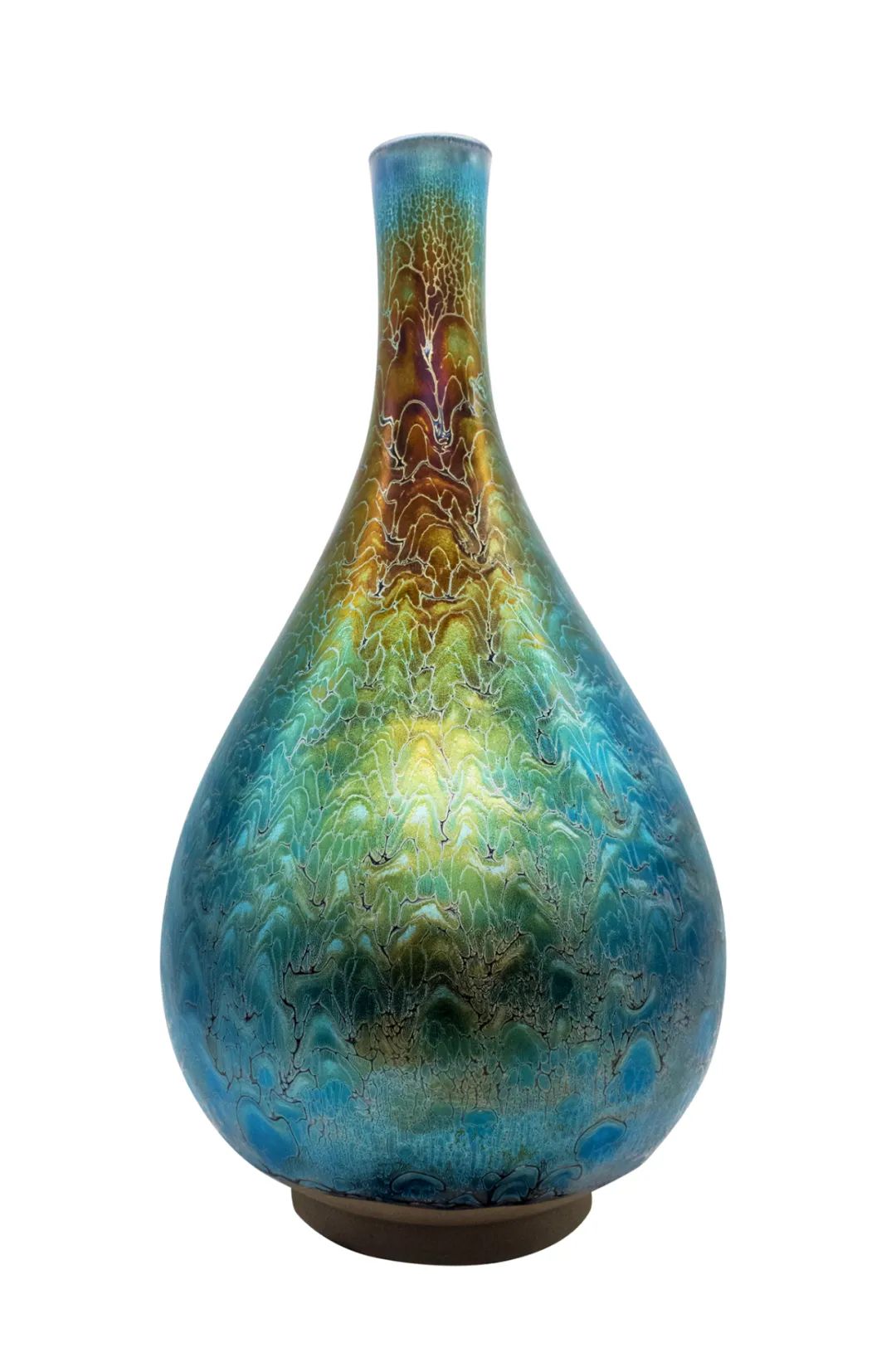 作品简介:本作品为宋代经典器型胆瓶,采用原矿釉经过高温一次烧制而成。器形古朴凝练,线条流畅。斑纹鳞次栉比,颜色金中泛紫,相得益彰,片片斑核如同起伏山峦,连绵不绝,含有江山如此多娇之意。作品造型独具神韵,釉面莹润,色彩深邃多变。既有含蓄风雅之韵,也有气吞山河之势。
