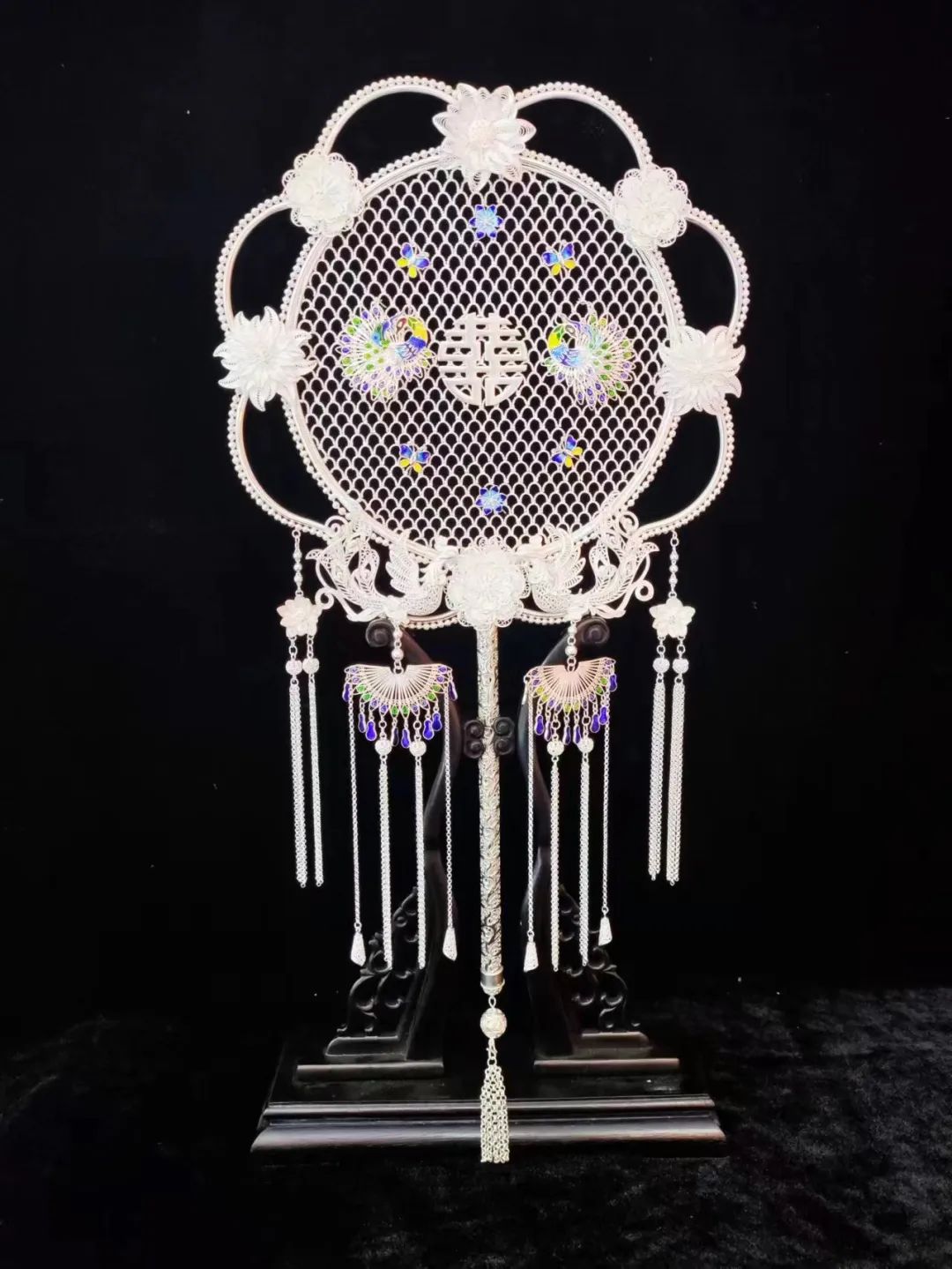 作品简介:采用编丝,花丝技艺纯手工敲片,拉丝、掐丝、炸珠、焊接、珐琅等多道工艺制作,整件物品丝毫不露外接痕迹,泾渭分明,活灵活现,细节之处的缕缕银丝线和錾技肌理效果展现得淋漓尽致,凸显了银丝的柔软与细腻、镂空的立体感。
