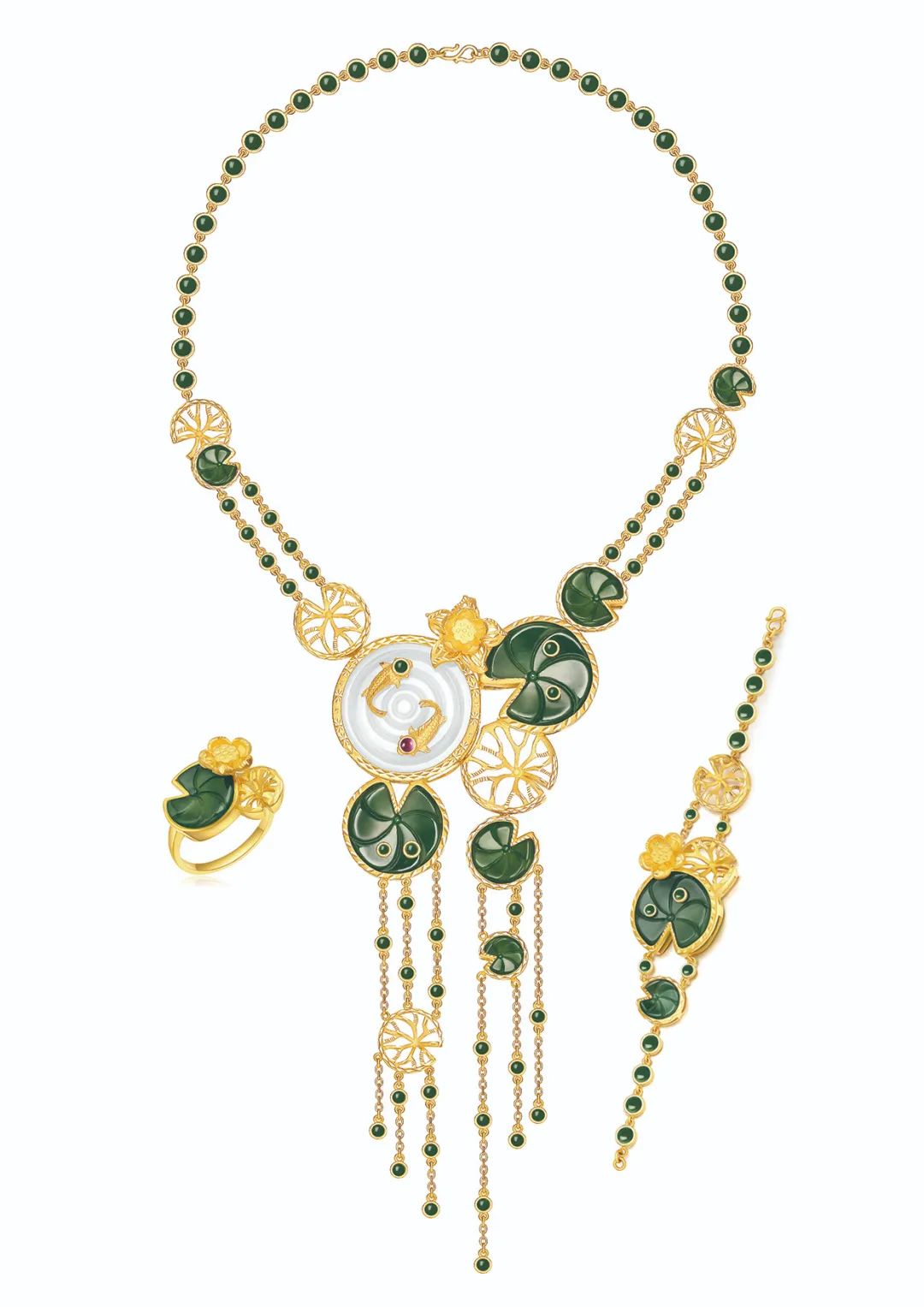 作品简介:产品以和田碧玉为主体,灼灼荷花点缀其间,与摇曳的碧玉流苏相映成趣,自古文人都喜欢借荷花与鲤鱼的美好组合,寓意吉祥幸福,连年有余,向人们传递美好祝愿,也象征着绿水青山,国泰民安。