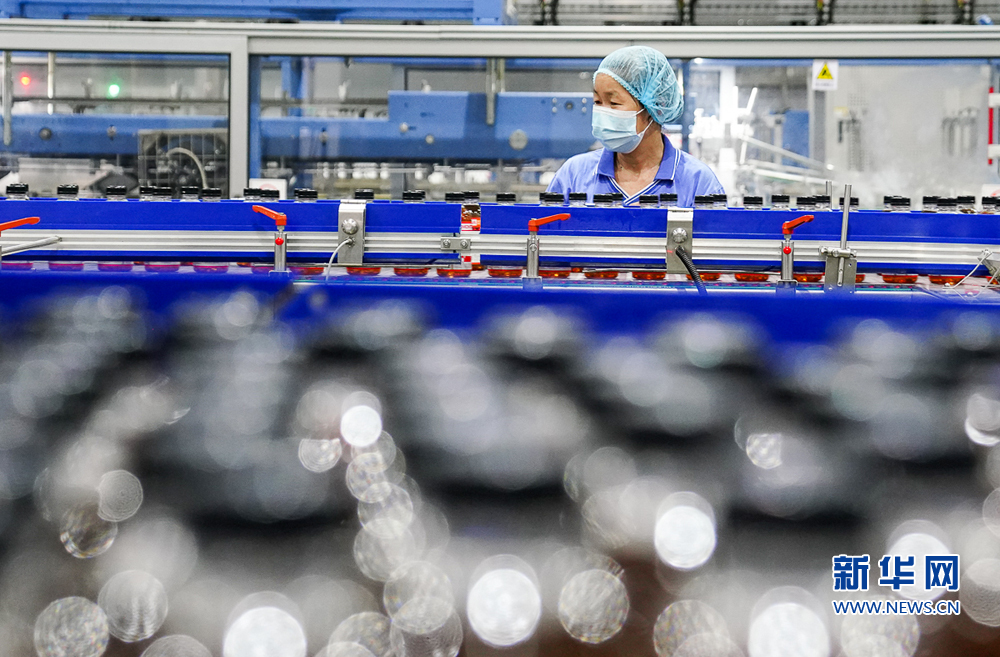 8月13日,福建盼盼饮料有限公司,一名女工在冷灌无菌生产线上工作,快速流动的罐装饮料形成独特光影画面。