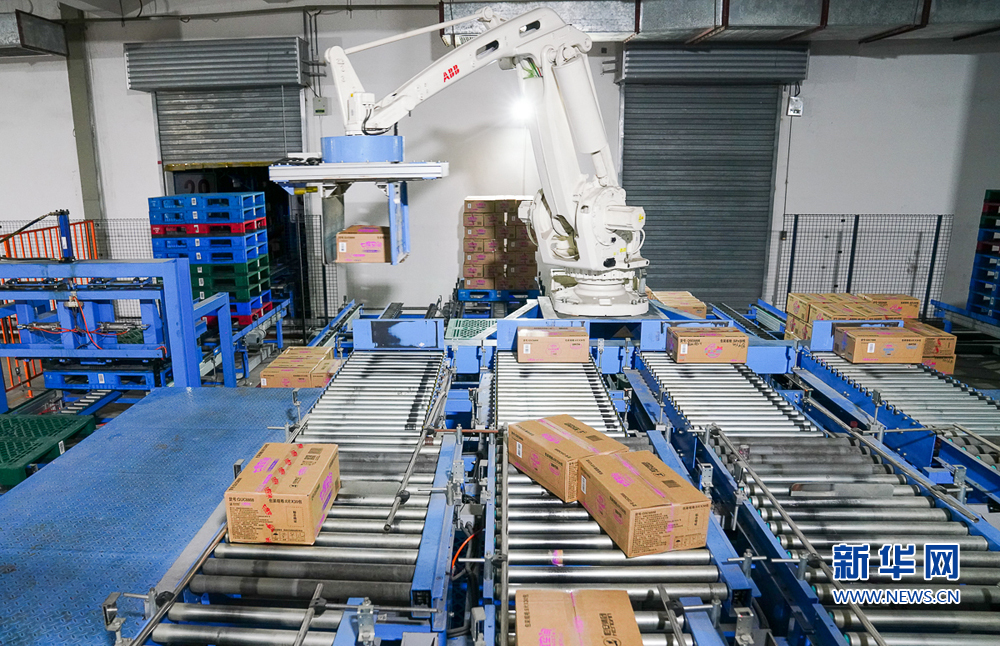 8月11日,恒安集团智能生产基地,机械手将产品转运至码垛区堆放。