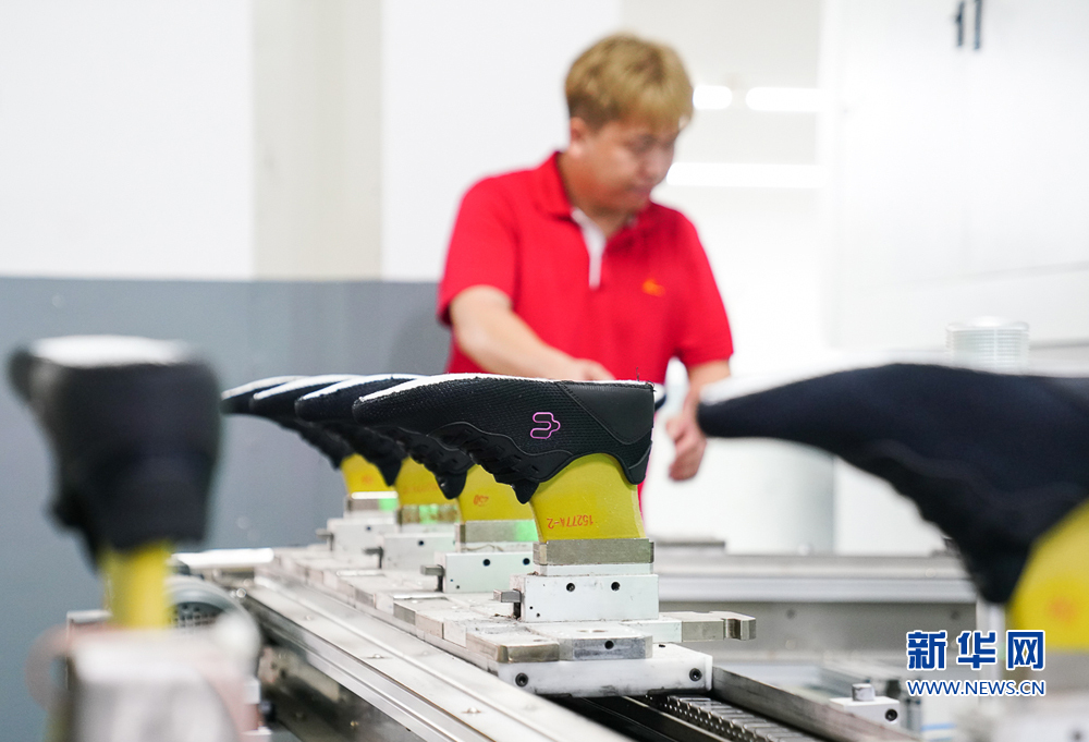 8月12日,福建省华增鞋业科技有限公司智能化车间,一名工人在柔性化智能生产线上检查产品质量。