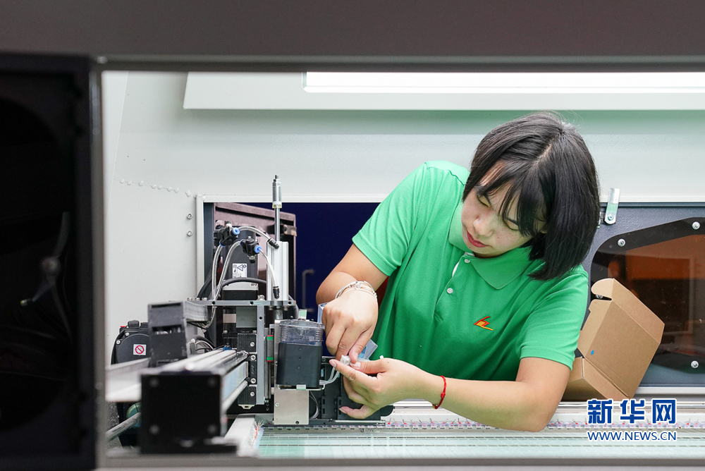 8月12日,福建省华增鞋业科技有限公司智能化车间,一名女工在智能印线机上进行换墨作业。