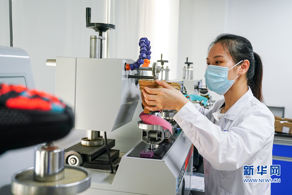 8月13日,位于晋江市的中国皮革和制鞋工业研究院耐磨实验室里,技术人员在做鞋底耐磨性能检测。